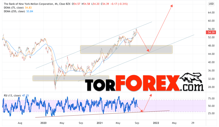 Дополнительным сигналом в пользу роста котировок Bank of New York Mellon выступит тест линии тренда на индикаторе относительной силы (RSI). Вторым сигналом станет отскок от нижней границы бычьего канала. Отменой варианта подъёма котировок стоимости акций компании Bank of New York Mellon станет падение и пробой уровня 40.55. Это укажет на пробой области поддержки и нижней границы канала, в этом случае можно рассматривать продолжение снижения бумаг в область на уровне 25.55. Ожидать подтверждения подъёма акций стоит с пробоем области сопротивления и закрытием выше уровня 58.05.