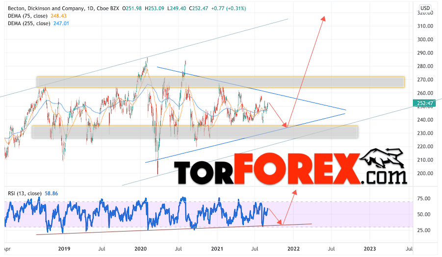Дополнительным сигналом в пользу роста котировок Becton, Dickinson and Company выступит тест линии тренда на индикаторе относительной силы (RSI), как видим, цена постоянно отталкиваются в момент такого теста. Вторым сигналом станет отскок от нижней границы бычьего канала. Отменой варианта подъёма котировок стоимости акций компании Becton, Dickinson and Company станет падение и пробой уровня 220.05. Это укажет на пробой области поддержки и нижней границы модели ”Треугольник”, в этом случае можно рассматривать продолжение снижения бумаг в область на уровне 185.05. Ожидать подтверждения подъёма акций стоит с пробоем области сопротивления и закрытием выше уровня 270.55, в этом случае состоится пробой верхней границы модели ”Треугольник”.