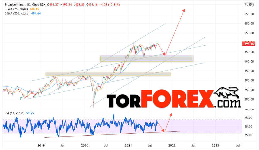 Мы также учитываем технический, фундаментальный анализ акций, новостной фон, общая геополитическая ситуация в мире и другие, более мелкие факторы. В прогнозах акций указаны целевые уровни для акций компании AVGO, причем как подъёма так и вероятного падения.