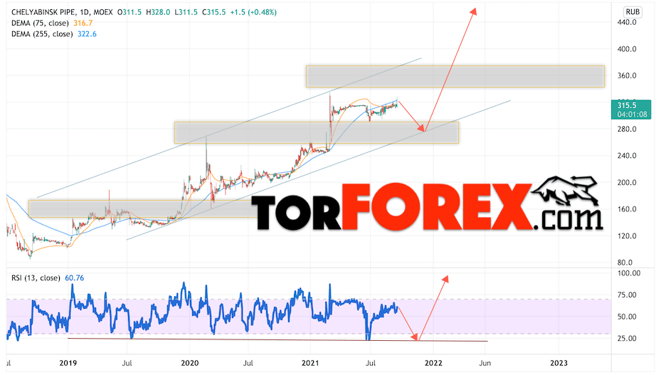 Дополнительным сигналом в пользу подъёма котировок Челябинский трубопрокатный завод выступит тест линии поддержки на индикаторе относительной силы (RSI). Вторым сигналом станет отскок от нижней границы долгосрочного бычьего канала. Отменой варианта роста котировок стоимости акций компании Челябинский трубопрокатный завод станет падение и пробой уровня 235. Это укажет на пробой области поддержки и продолжение падения в область на уровне 155. Ожидать ускорения подъёма акций стоит с пробоем области сопротивления и закрытием выше уровня 355.