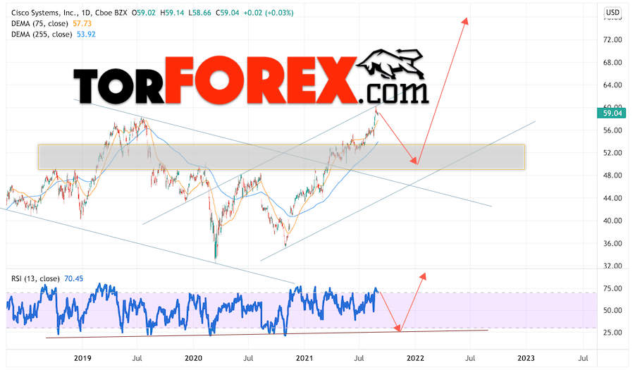 Стоит ли покупать или продавать акции Cisco Systems сегодня? До каких уровней могут расти акции этой компании через год, два, три? Сколько будут стоить бумаги Cisco Systems в 2021, 2022, 2023 годах? Мы давно составляет прогнозы курсов валют, а также можем предсказать поведение фондового рынка с помощью технического анализа и простых индикаторов.