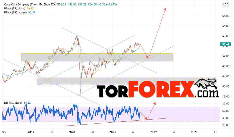 Дополнительным сигналом в пользу роста котировок Coca-Cola выступит тест линии поддержки на индикаторе относительной силы (RSI). Вторым сигналом станет отскок от нижней границы бычьего канала. Отменой варианта подъёма котировок стоимости акций компании KO станет падение и пробой уровня 47.05. Это укажет на пробой нижней границы модели, в этом случае можно рассматривать продолжение снижения бумаг в область на уровне 40.05. Ожидать подтверждения подъёма акций стоит с пробоем области сопротивления и закрытием выше уровня 60.05, что укажет на пробой важного уровня с которого и началось падение во время пандемии.
