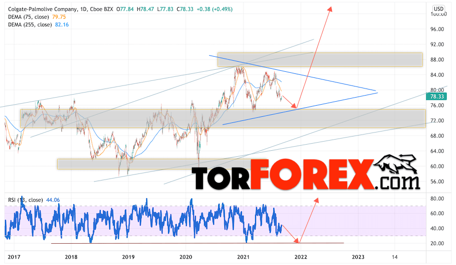 Дополнительным сигналом в пользу роста котировок Colgate-Palmolive выступит тест линии тренда на индикаторе относительной силы (RSI). Вторым сигналом станет отскок от нижней границы модели ”Треугольник”. Отменой варианта подъёма котировок стоимости акций компании Colgate-Palmolive станет падение и пробой уровня 65.55. Это укажет на пробой области поддержки и нижней границы канала, в этом случае можно рассматривать продолжение снижения бумаг в область на уровне 45.55. Ожидать подтверждения подъёма акций стоит с пробоем области сопротивления и закрытием выше уровня 86.55, что укажет на пробой верхней границы модели ”Треугольник”.