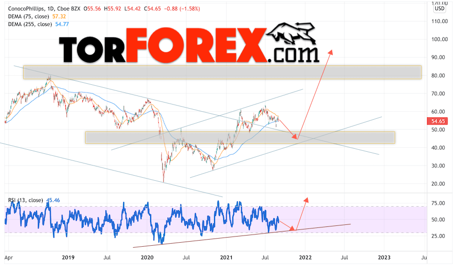Стоит ли покупать или продавать акции ConocoPhillips сегодня? До каких уровней могут расти акции этой компании через год, два, три? Сколько будут стоить бумаги ConocoPhillips в 2021, 2022, 2023 годах? Мы давно составляет прогнозы курсов валют, а также можем предсказать поведение фондового рынка с помощью технического анализа и простых индикаторов.