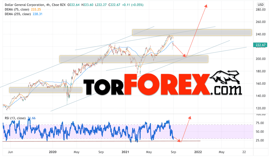Дополнительным сигналом в пользу роста котировок Dollar General Corporation выступит тест линии тренда на индикаторе относительной силы (RSI). Вторым сигналом станет отскок от нижней границы бычьего канала. Отменой варианта подъёма котировок стоимости акций компании Dollar General Corporation станет падение и пробой уровня 190.05. Это укажет на пробой области поддержки, в этом случае можно рассматривать продолжение снижения бумаг в область на уровне 140.55. Ожидать подтверждения подъёма акций стоит с пробоем области сопротивления и закрытием выше уровня 260.55, что укажет на пробой верхней границы восходящего канала.