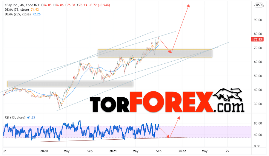 Дополнительным сигналом в пользу роста котировок eBay выступит тест линии тренда на индикаторе относительной силы (RSI). Вторым сигналом станет отскок от нижней границы восходящего канала. Отменой варианта подъёма котировок стоимости акций компании eBay станет падение и пробой уровня 55.55. Это укажет на пробой области поддержки, в этом случае можно рассматривать продолжение снижения бумаг в область на уровне 30.05. Ожидать подтверждения подъёма акций стоит с пробоем области сопротивления и закрытием выше уровня 85.55, что укажет на пробой верхней границы восходящего канала.