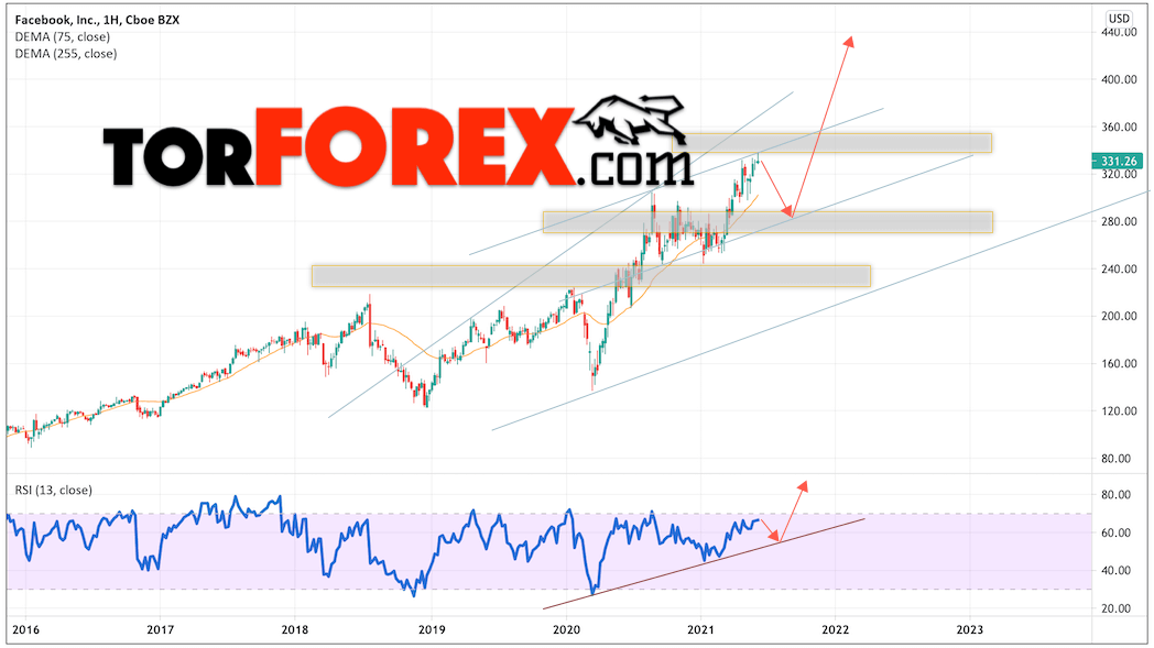 Дополнительным сигналом в пользу подъёма котировок FB выступит тест восходящей линии тренда на индикаторе относительной силы (RSI). Вторым сигналом станет отскок от нижней границы бычьего канала. Отменой варианта роста стоимости акций Facebook в рамках прогноза на 2021 и 2021 год станет падение и пробой уровня 255.05. Это укажет на пробой нижней восходящего канала и продолжение падения ниже уровня 205.05. Ожидать подтверждение роста котировок FB стоит с пробоем области сопротивления и закрытием выше уровня 365.55, в этом случае состоится пробой верхней границы бычьего канала.