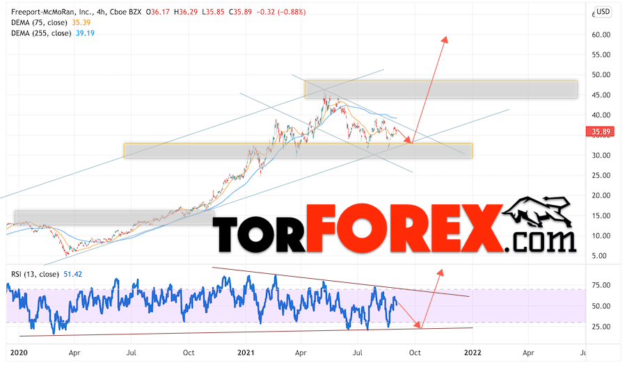 Мы также учитываем технический, фундаментальный анализ акций, новостной фон, общая геополитическая ситуация в мире и другие, более мелкие факторы. В прогнозах акций указаны целевые уровни для акций компании FCX, причем как подъёма так и вероятного падения.
