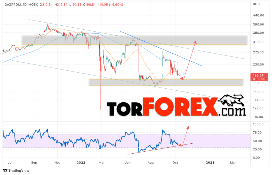 Котировки акций компании Газпром продолжает движение в рамках коррекции и нисходящего канала. Сохраняется потенциал для формирования разворотной модели ”Голова и плечи”. В момент публикации прогноза цена акций Газпром составляет 198.81. Скользящие средние указывают на наличие медвежьей тенденции. Цены пробили область между сигнальными линиями вниз, что указывает на давление со стороны продавцов актива и потенциальное падения уже с ближайшее время. На данный момент стоит ожидать попытку развития коррекции курса акций и тест уровня поддержки вблизи области 185.05. Затем отскок вверх и продолжение роста стоимости акций в область выше уровня 310.05.