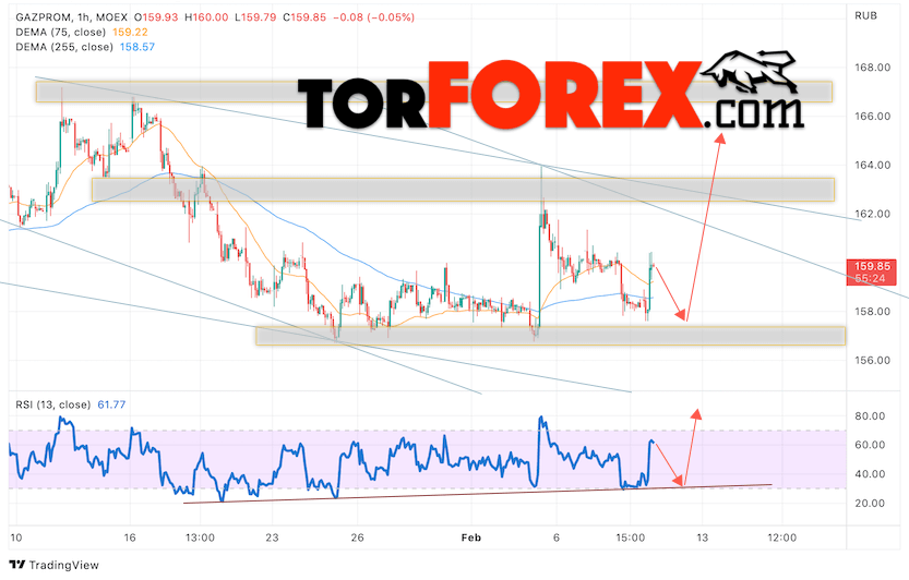 В пользу подъёма котировок GAZP выступит тест линии тренда на индикаторе относительной силы. Вторым сигналом выступит отскок от верхней границы нисходящего канала. Отменой варианта роста стоимости акций Газпром станет падение и пробой уровня 155. Это укажет на пробой области поддержки и продолжение падения в область ниже уровня 145. Ожидать подтверждения росту котировок GAZP стоит с пробоем области сопротивления и закрытием выше уровня 162.