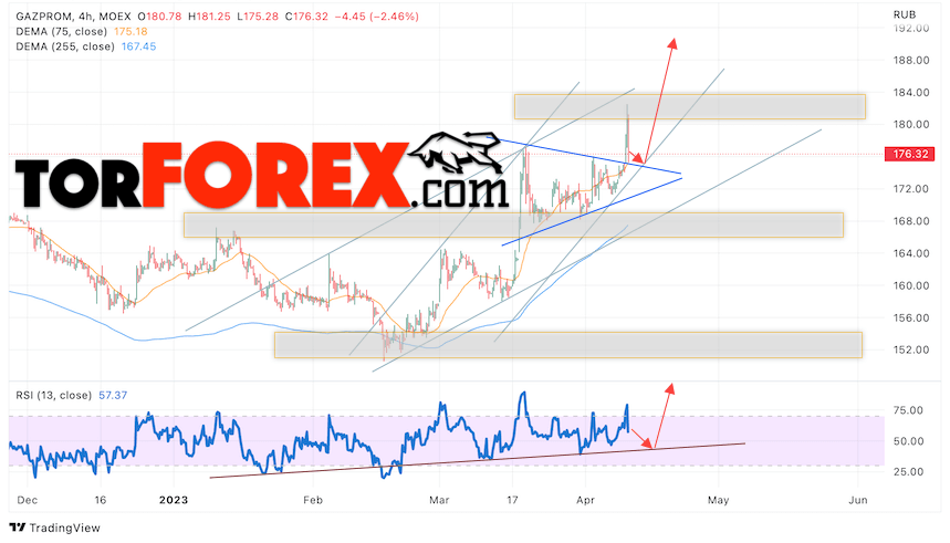 Котировки акций Газпром торгуется на уровне 176. Бумага продолжает движение в рамках коррекции и начала отработки модели ”Треугольник”. Скользящие средние указывают на наличие бычьей тенденции по акциям компании. Цены вновь тестируют область между сигнальными линиями, что указывает на давление со стороны покупателей актива и потенциальное продолжение роста уже с текущих уровней. В рамках прогноза курса и стоимости Газпром на 12 апреля 2023 стоит ожидать попытку развития коррекции стоимости и тест уровня поддержки вблизи области 174. Откуда стоит ожидать отскок вверх и продолжения роста курса акций Газпром с целью ниже уровня 195.