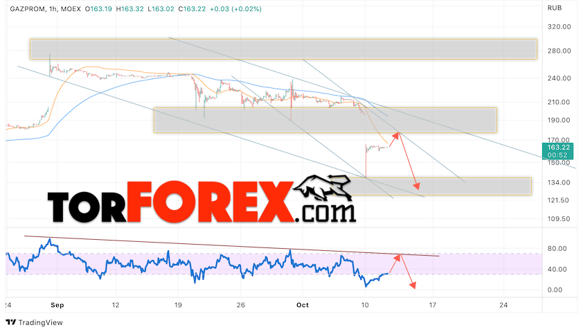 Таким образом, Газпром прогноз акций на 12 октября 2022 предполагает попытку теста области сопротивления вблизи уровня 170. Далее, продолжение падения котировок GAZP с целью ниже уровня 130. Отменой варианта снижения цены акций Газпром выступит сильный рост и пробой уровня 185. Это укажет на пробой верхней гардины нисходящего канала. В этом случае стоит ожидать продолжения подъёма котировок бумаг выше уровня 225.