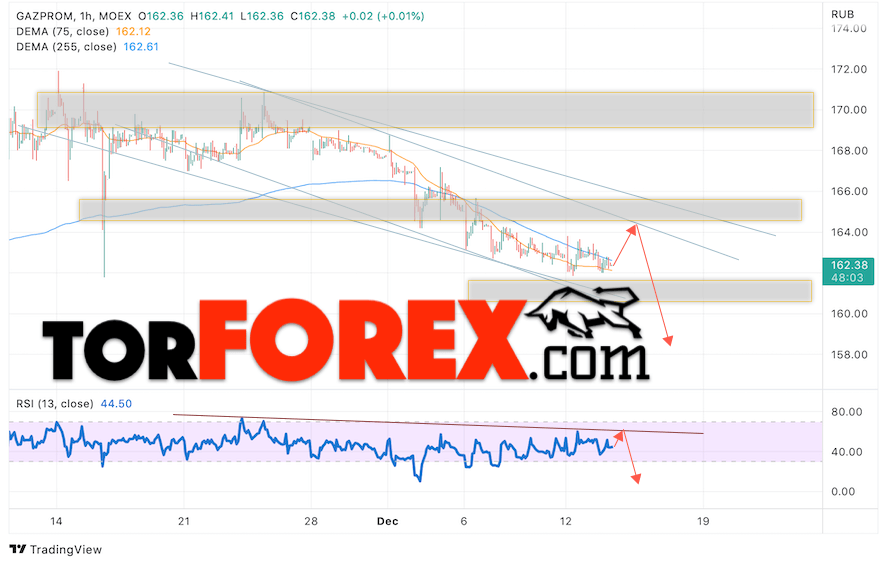 Таким образом, Газпром прогноз акций на 14 декабря 2022 предполагает попытку теста области сопротивления вблизи уровня 164. Далее, продолжение падения котировок GAZP с целью ниже уровня 157. Отменой варианта снижения цены акций Газпром выступит сильный рост и пробой уровня 167. Это укажет на пробой верхней границы нисходящего канала. В этом случае стоит ожидать продолжения роста котировок бумаг выше уровня 185.