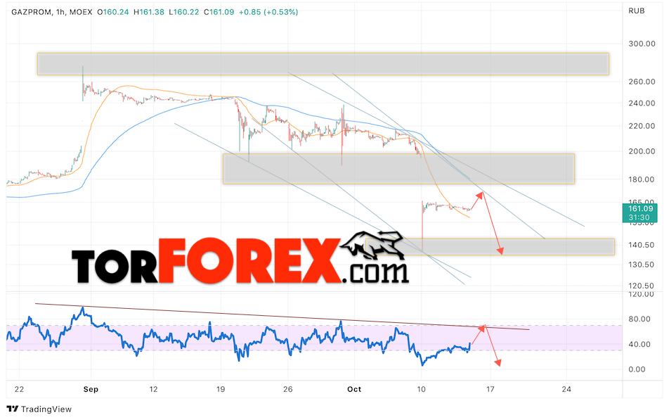 Таким образом, Газпром прогноз акций на 14 октября 2022 предполагает попытку теста области сопротивления вблизи уровня 165. Далее, продолжение падения котировок GAZP с целью ниже уровня 135. Отменой варианта снижения цены акций Газпром выступит сильный рост и пробой уровня 185. Это укажет на пробой верхней гардины нисходящего канала. В этом случае стоит ожидать продолжения подъёма котировок бумаг выше уровня 225.