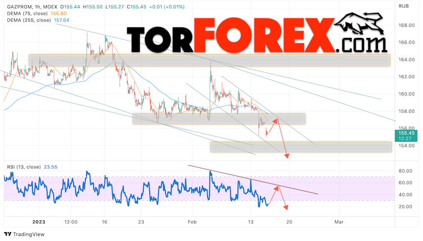 В пользу снижения котировок GAZP выступит тест линии тренда на индикаторе относительной силы. Вторым сигналом выступит отбой от верхней границы нисходящего канала. Отменой варианта снижения стоимости акций Газпром станет сильный рост и пробой уровня 160. Это укажет на пробой области сопротивления и продолжение роста в область выше уровня 175. Ожидать подтверждения падению котировок GAZP стоит с пробоем области поддержки и закрытием ниже уровня 153.
