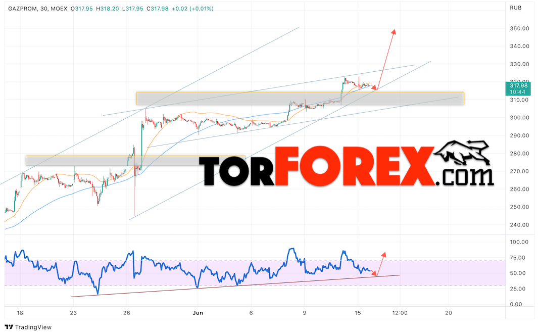 В пользу подъёма котировок GAZP выступит тест нисходящей линии поддержки на индикаторе относительной силы. Вторым сигналом выступит отскок от нижней границы бычьего канала. Отменой варианта роста стоимости акций Газпром станет падение и пробой уровня 295. Это укажет на пробой нижней границы бычьего канала и продолжение падения в область ниже уровня 265. Ожидать подтверждения подъёма котировок GAZP стоит с пробоем области сопротивления и закрытием выше уровня 325, что укажет на пробой верхней границы бычьего канала.