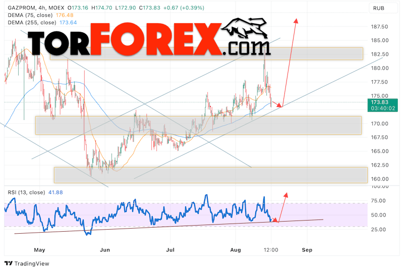 Котировки акций Газпром торгуется на уровне 173. Бумага продолжает движение в рамках развития сильной коррекции после агрессивного роста. Скользящие средние указывают на наличие восходящей тенденции по акциям компании. Цены вновь тестируют область между сигнальными линиями, что указывает на давление со стороны покупателей актива и потенциальное продолжение падения уже с текущих уровней. В рамках прогноза курса и стоимости Газпром на 17 августа 2023 стоит ожидать попытку развития коррекции стоимости и тест уровня поддержки вблизи области 170. Откуда стоит ожидать отскок вверх и продолжения роста курса акций Газпром с целью выше уровня 187.
