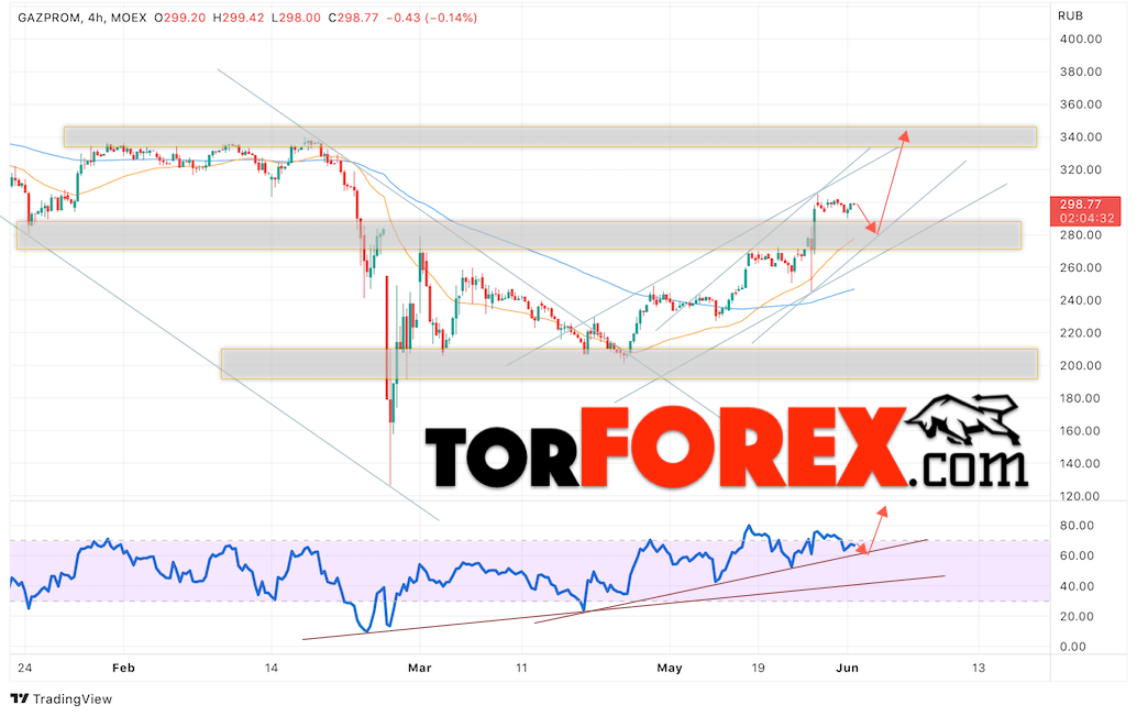 Котировки акций Газпром торгуется на уровне 298. Бумага продолжает движение в рамках роста и восходящего канала. Скользящие средние указывают на наличие бычьей тенденции по акциям компании. Цены пробили область между сигнальными линиями вверх, что указывает на давление со стороны покупателей актива и потенциальное продолжение роста уже с текущих уровней. В рамках прогноза курса и стоимости Газпром на 1 июня 2022 стоит ожидать попытку незначительной коррекции и тест уровня поддержки вблизи области 280. Откуда стоит ожидать отскок вверх и продолжения роста курса акций Газпром с целью выше уровня 345.