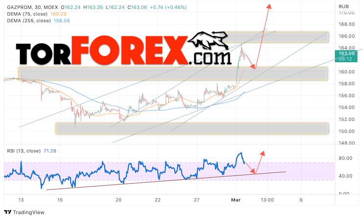 В пользу роста котировок GAZP выступит тест линии тренда на индикаторе относительной силы. Вторым сигналом выступит отбой от нижней границы бычьего канала. Отменой варианта роста стоимости акций Газпром станет падение и пробой уровня 155. Это укажет на пробой области поддержки и продолжение падения в область ниже уровня 145. Ожидать подтверждения росту котировок GAZP стоит с пробоем области сопротивления и закрытием выше уровня 167.