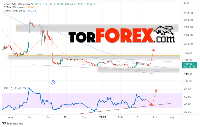 Дополнительным сигналом в пользу роста котировок GAZP выступит тест линии поддержки на индикаторе относительной силы. Вторым сигналом станет отбой от верхней границы нисходящего канала. Отменой варианта роста акций Газпром на следующей торговой неделе станет падение цен и пробой уровня 135.05. Это укажет на пробой области поддержки и продолжение падения котировок GAZP в область ниже уровня 100.55. Ожидать подтверждения росту котировок GAZP стоит с пробоем области сопротивления и закрытием выше уровня 175.05, что укажет на пробой верхней границы очередного нисходящего канала.
