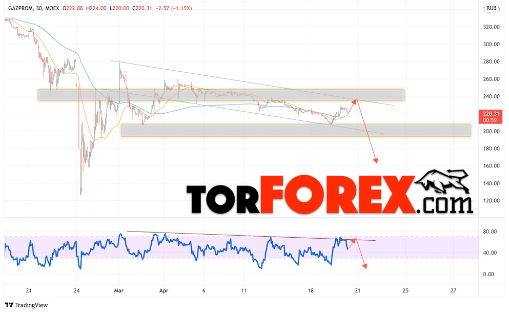 Котировки акций Газпром торгуется на уровне 220. Бумага продолжает движение в рамках падения и нисходящего канала. Скользящие средние указывают на наличие бычьей тенденции по акциям компании. Цены пробили область между сигнальными линиями вверх, что указывает на давление со стороны покупателей актива и потенциальное продолжение роста уже с текущих уровней. В рамках прогноза курса и стоимости Газпром на 20 апреля 2022 стоит ожидать попытку незначительной коррекции и тест уровня сопротивления вблизи области 235. Откуда стоит ожидать отскок вниз и продолжения падения курса акций Газпром с целью ниже уровня 165.