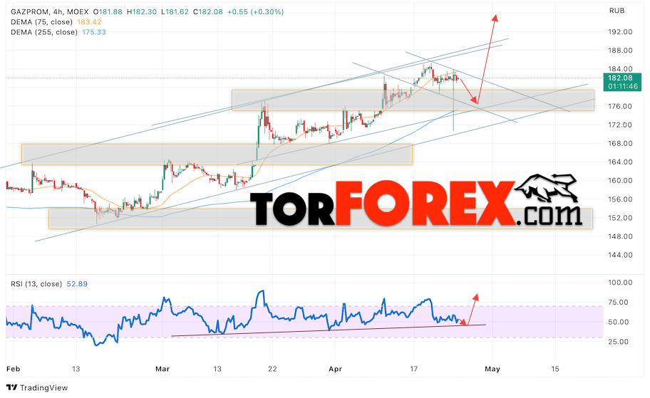 Таким образом, Газпром прогноз акций на 25 апреля 2023 предполагает попытку теста области поддержки вблизи уровня 175. Далее, продолжение роста котировок GAZP с целью выше уровня 205. Отменой варианта подъёма цены акций Газпром выступит падение и пробой уровня 170. Это укажет на пробой нижней границы бычьего канала. В этом случае стоит ожидать продолжения падения котировок бумаг ниже уровня 145.