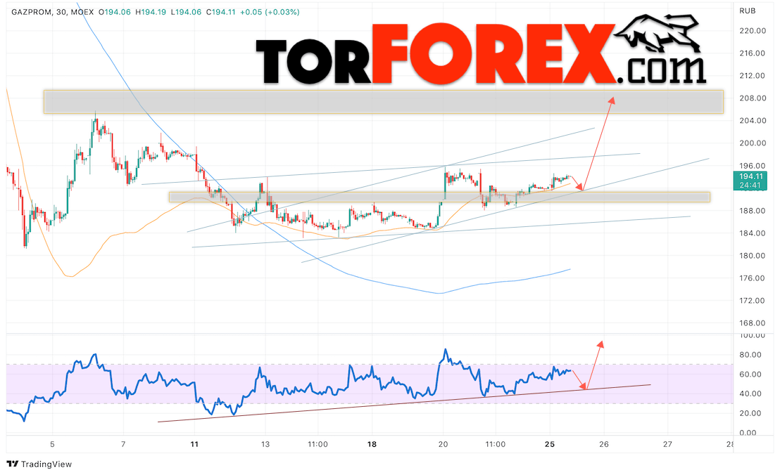 В пользу подъёма котировок GAZP выступит тест линии тренда на индикаторе относительной силы. Вторым сигналом выступит отскок от нижней границы бычьего канала. Отменой варианта роста стоимости акций Газпром станет падение и пробой уровня 183. Это укажет на пробой нижней границы бычьего канала и продолжение падения в область ниже уровня 165. Ожидать подтверждения росту котировок GAZP стоит с пробоем области сопротивления и закрытием выше уровня 200, что укажет на пробой верхней границы бычьего канала, а это сильный сигнал для подъёма котировок как минимум на ширину канала.