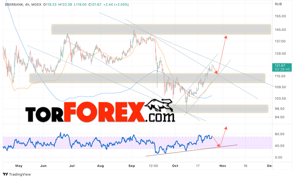 В пользу роста котировок GAZP выступит тест пробитой линии тренда на индикаторе относительной силы. Вторым сигналом выступит отскок от верхней границы нисходящего канала, который также был пробит покупателями вверх. Отменой варианта подъёма стоимости акций Газпром станет падение и пробой уровня 140. Это укажет на пробой области поддержки и продолжение падения в область ниже уровня 95. Ожидать подтверждения росту котировок GAZP стоит с пробоем области сопротивления и закрытием выше уровня 175.