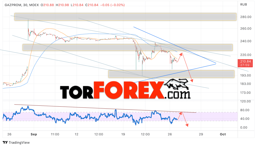 Котировки акций Газпром торгуется на уровне 210. Бумага продолжает движение в рамках коррекции и формирования модели ”Треугольник”. Скользящие средние указывают на наличие медвежьей тенденции по акциям компании. Цены ушли вниз от области между сигнальными линиями вниз, что указывает на давление со стороны продавцов актива и потенциальное продолжение падения уже с текущих уровней. В рамках прогноза курса и стоимости Газпром на 27 сентября 2022 стоит ожидать попытку развития роста и тест уровня сопротивления вблизи области 220. Откуда стоит ожидать отскок вниз и продолжения падения курса акций Газпром с целью ниже уровня 180.