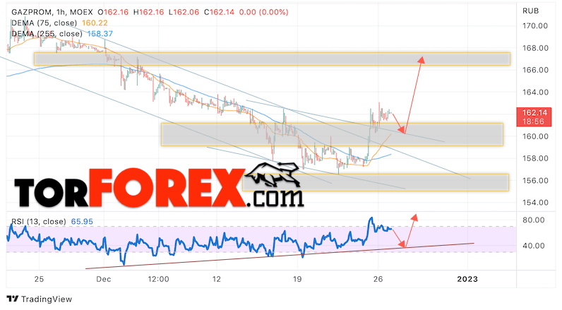 Таким образом, Газпром прогноз акций на 28 декабря 2022 предполагает попытку теста области поддержки вблизи уровня 160. Далее, продолжение роста котировок GAZP с целью выше уровня 166. Отменой варианта подъёма цены акций Газпром выступит падение и пробой уровня 159. Это укажет на пробой верхней границы нисходящего канала. В этом случае стоит ожидать продолжения падения котировок бумаг ниже уровня 145.