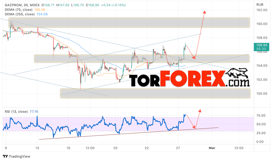Котировки акций Газпром торгуется на уровне 156. Бумага продолжает движение в рамках развития коррекции и покинули пределы нисходящего канала. Скользящие средние указывают на наличие бычьей тенденции по акциям компании. Цены ушли вверх от области между сигнальными линиями, что указывает на давление со стороны покупателей актива и потенциальное продолжение падения уже с текущих уровней. В рамках прогноза курса и стоимости Газпром на 28 февраля 2023 стоит ожидать попытку развития коррекции стоимости и тест уровня поддержки вблизи области 155. Откуда стоит ожидать отскок вверх и продолжения роста курса акций Газпром с целью ниже уровня 162.