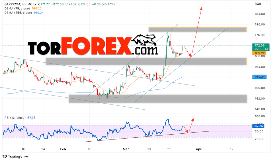Котировки акций Газпром торгуется на уровне 172. Бумага продолжает движение в рамках роста и бычьего канала. Скользящие средние указывают на наличие бычьей тенденции по акциям компании. Цены ушли вверх от области между сигнальными линиями, что указывает на давление со стороны покупателей актива и потенциальное продолжение роста уже с текущих уровней. В рамках прогноза курса и стоимости Газпром на 28 марта 2023 стоит ожидать попытку развития коррекции стоимости и тест уровня поддержки вблизи области 170. Откуда стоит ожидать отскок вверх и продолжения роста курса акций Газпром с целью ниже уровня 195.