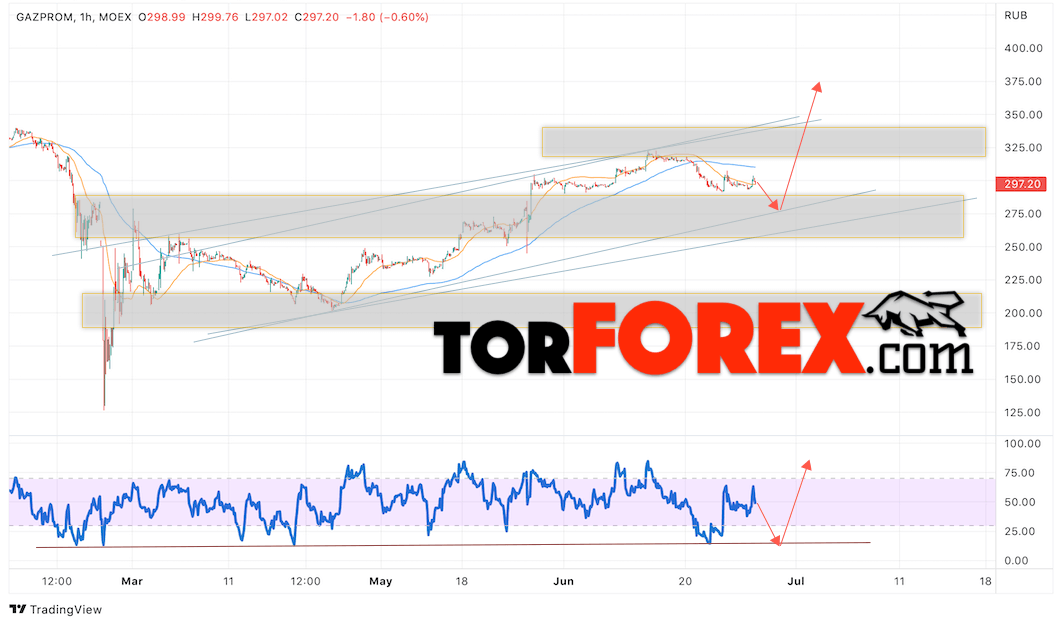 Котировки акций Газпром торгуется на уровне 297. Бумага продолжает движение в рамках коррекции и восходящего канала. Скользящие средние указывают на наличие медвежьей тенденции по акциям компании. Цены вновь тестируют область между сигнальными линиями, что указывает на давление со стороны продавцов актива и потенциальное продолжение падения уже с текущих уровней. В рамках прогноза курса и стоимости Газпром на 29 июня 2022 стоит ожидать попытку развития незначительной коррекции и тест уровня поддержки вблизи области 275. Откуда стоит ожидать отскок вверх и продолжения роста курса акций Газпром с целью выше уровня 375.