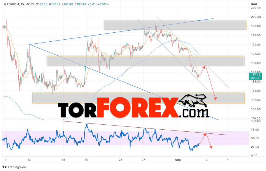 В пользу падения котировок GAZP выступит тест линии тренда на индикаторе относительной силы. Вторым сигналом выступит отскок от верхней границы нисходящего канала. Отменой варианта падения стоимости акций Газпром станет сильный рост и пробой уровня 192. Это укажет на пробой верхней границы модели и продолжение роста в область выше уровня 210. Ожидать подтверждения падению котировок GAZP стоит с пробоем области поддержки и закрытием ниже уровня 185.