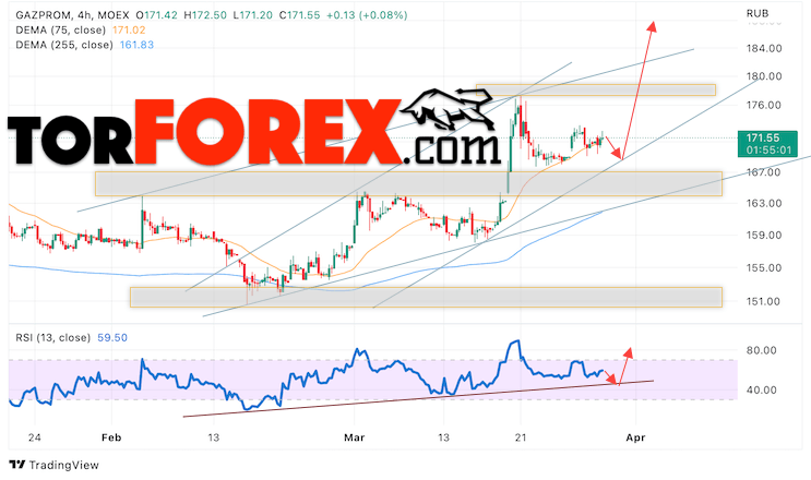 Котировки акций Газпром торгуется на уровне 171. Бумага продолжает движение в рамках роста и бычьего канала. Скользящие средние указывают на наличие бычьей тенденции по акциям компании. Цены вновь тестируют область между сигнальными линиями, что указывает на давление со стороны покупателей актива и потенциальное продолжение роста уже с текущих уровней. В рамках прогноза курса и стоимости Газпром на 30 марта 2023 стоит ожидать попытку развития коррекции стоимости и тест уровня поддержки вблизи области 168. Откуда стоит ожидать отскок вверх и продолжения роста курса акций Газпром с целью ниже уровня 195.