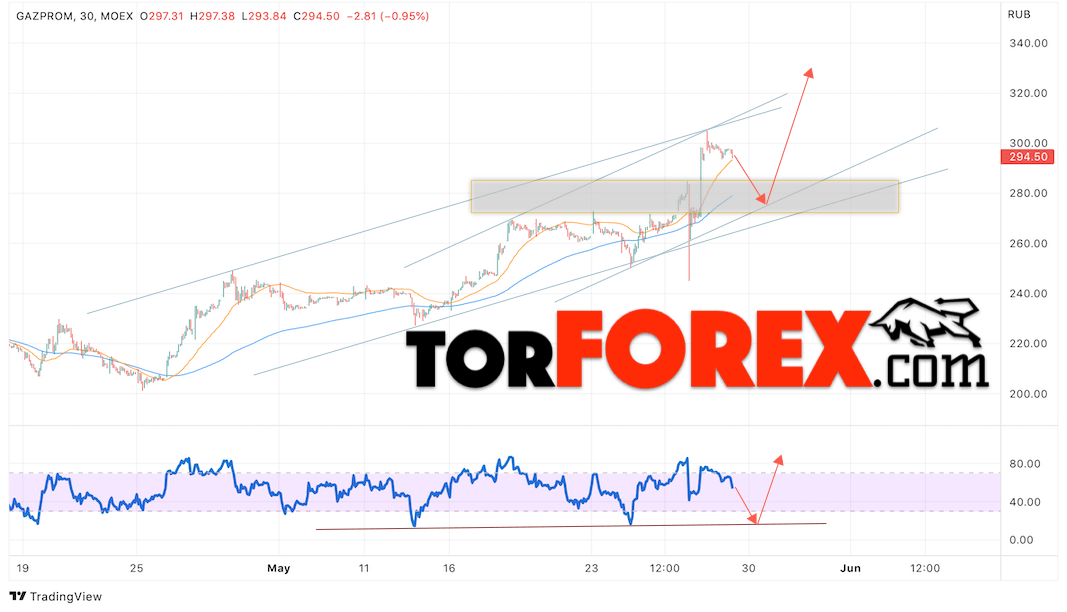 В пользу подъёма котировок GAZP выступит тест нисходящей линии поддержки на индикаторе относительной силы. Вторым сигналом выступит отскок от нижней границы бычьего канала. Отменой варианта роста стоимости акций Газпром станет падение и пробой уровня 250. Это укажет на пробой нижней границы бычьего канала и продолжение падения в область ниже уровня 185. Ожидать подтверждения подъёма котировок GAZP стоит с пробоем области сопротивления и закрытием выше уровня 310.