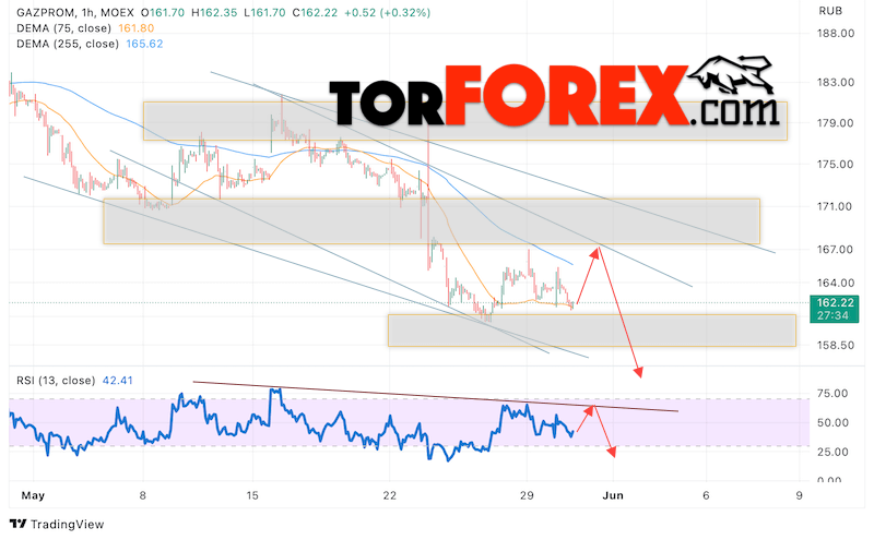 Таким образом, Газпром прогноз акций на 31 мая 2023 предполагает попытку теста области сопротивления вблизи уровня 167. Далее, продолжение падения котировок GAZP с целью ниже уровня 155. Отменой варианта падения цены акций Газпром выступит сильный рост и пробой уровня 175. Это укажет на пробой верхней границы медвежьего канала. В этом случае стоит ожидать продолжения подъёма котировок бумаг выше уровня 185.