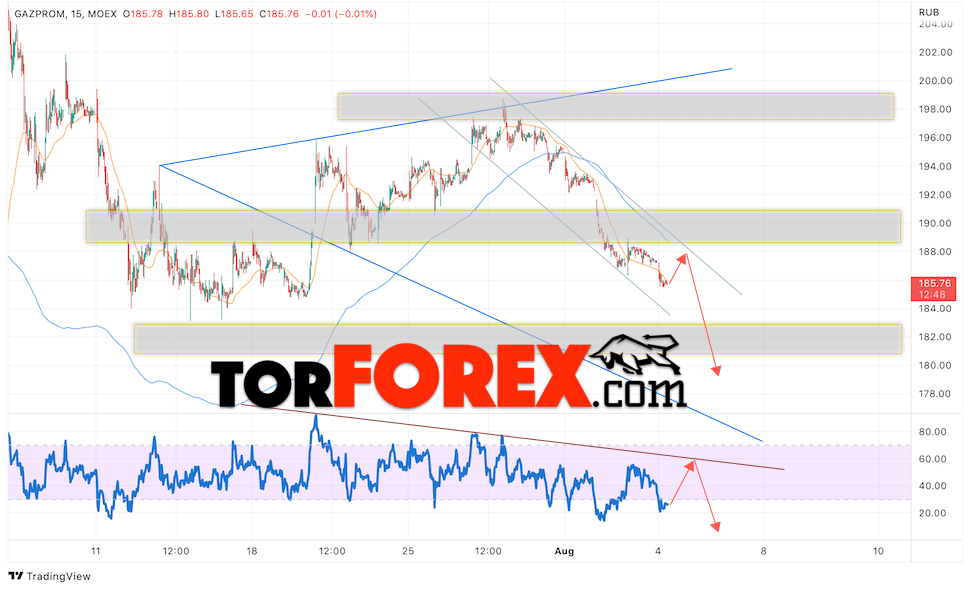 В пользу падения котировок GAZP выступит тест линии тренда на индикаторе относительной силы. Вторым сигналом выступит отскок от верхней границы нисходящего канала. Отменой варианта падения стоимости акций Газпром станет сильный рост и пробой уровня 190. Это укажет на пробой верхней границы модели и продолжение роста в область выше уровня 205. Ожидать подтверждения падению котировок GAZP стоит с пробоем области поддержки и закрытием ниже уровня 183.
