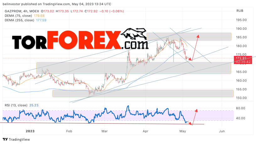 Котировки акций Газпром торгуется на уровне 172. Бумага продолжает движение в рамках развития медвежьей коррекции и бычьего канала. Скользящие средние указывают на наличие медвежьей тенденции по акциям компании. Цены пробили область между сигнальными линиями вниз, что указывает на давление со стороны продавцов актива и потенциальное продолжение падения уже с текущих уровней. В рамках прогноза курса и стоимости Газпром на 5 мая 2023 стоит ожидать попытку развития коррекции стоимости и тест уровня поддержки вблизи области 165. Откуда стоит ожидать отскок вверх и продолжения роста курса акций Газпром с целью выше уровня 185.