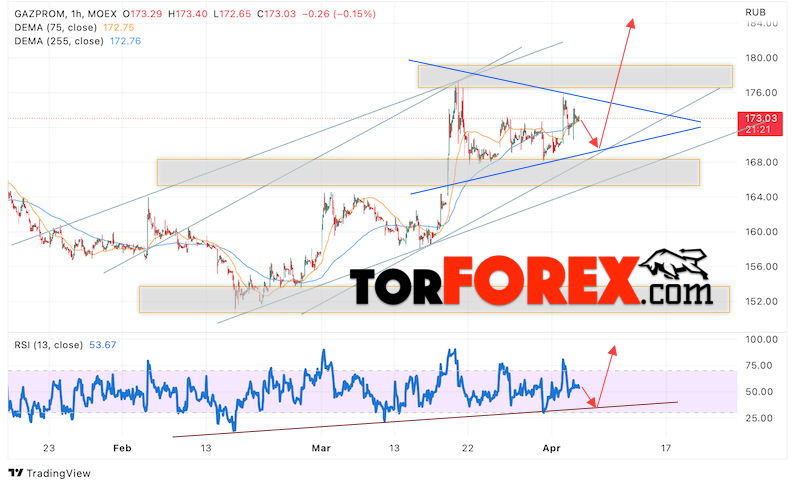 Котировки акций Газпром торгуется на уровне 173. Бумага продолжает движение в рамках роста и формирования модели ”Треугольник”. Скользящие средние указывают на наличие бычьей тенденции по акциям компании. Цены вновь тестируют область между сигнальными линиями, что указывает на давление со стороны покупателей актива и потенциальное продолжение роста уже с текущих уровней. В рамках прогноза курса и стоимости Газпром на 6 апреля 2023 стоит ожидать попытку развития коррекции стоимости и тест уровня поддержки вблизи области 170. Откуда стоит ожидать отскок вверх и продолжения роста курса акций Газпром с целью ниже уровня 190.