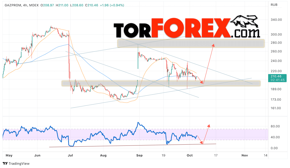 Таким образом, Газпром прогноз акций на 6 октября 2022 предполагает попытку теста области поддержки вблизи уровня 205. Далее, продолжение роста котировок GAZP с целью выше уровня 275. Отменой варианта подъёма цены акций Газпром выступит падение и пробой уровня 185. Это укажет на пробой нижней границы бычьего канала. В этом случае стоит ожидать продолжения падения котировок бумаг ниже уровня 145.