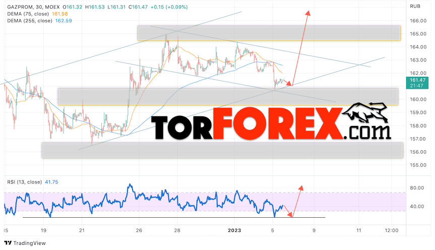 Таким образом, Газпром прогноз акций на 6 января 2023 предполагает попытку теста области поддержки вблизи уровня 160. Далее, продолжение роста котировок GAZP с целью выше уровня 170. Отменой варианта подъёма цены акций Газпром выступит падение и пробой уровня 157. Это укажет на пробой верхней границы нисходящего канала. В этом случае стоит ожидать продолжения падения котировок бумаг ниже уровня 145.