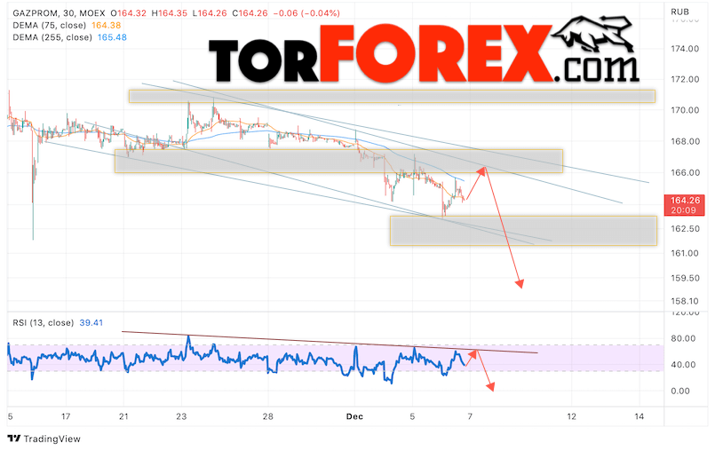 В пользу снижения котировок GAZP выступит тест линии тренда на индикаторе относительной силы. Вторым сигналом выступит отскок от верхней границы нисходящего канала. Отменой варианта падения стоимости акций Газпром станет сильный рост и пробой уровня 170. Это укажет на пробой области сопротивления и продолжение роста в область выше уровня 195. Ожидать подтверждения падению котировок GAZP стоит с пробоем области поддержки и закрытием ниже уровня 160.