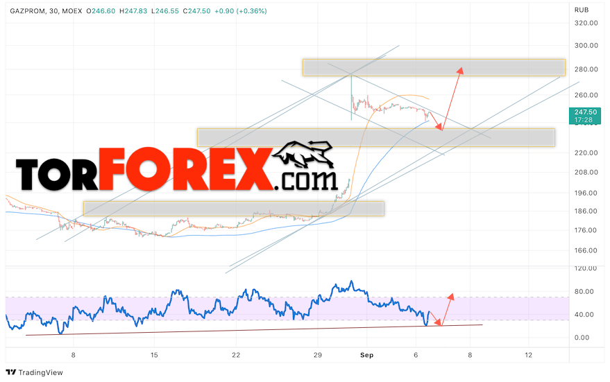 В пользу подъёма котировок GAZP выступит тест бычьей линии тренда на индикаторе относительной силы. Вторым сигналом выступит отскок от нижней границы бычьего канала. Отменой варианта роста стоимости акций Газпром станет падение и пробой уровня 200. Это укажет на пробой нижней границы бычьего канала и продолжение падения в область ниже уровня 165. Ожидать подтверждения росту котировок GAZP стоит с пробоем области сопротивления и закрытием выше уровня 265, что укажет на пробой верхней границы нисходящего канала коррекции.
