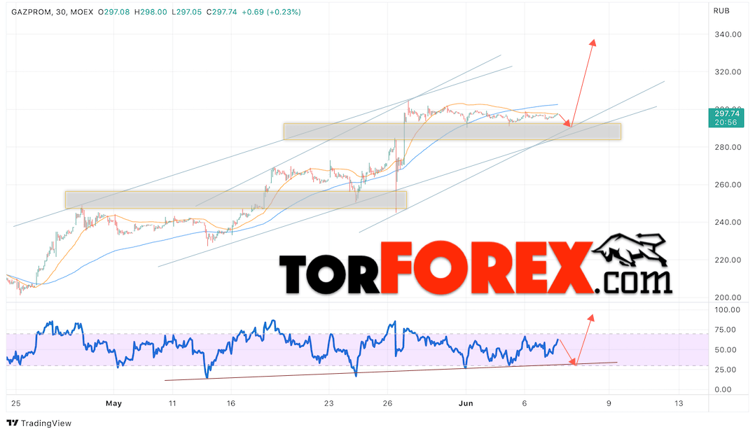 В пользу подъёма котировок GAZP выступит тест нисходящей линии поддержки на индикаторе относительной силы. Вторым сигналом выступит отскок от нижней границы бычьего канала. Отменой варианта роста стоимости акций Газпром станет падение и пробой уровня 270. Это укажет на пробой нижней границы бычьего канала и продолжение падения в область ниже уровня 240. Ожидать подтверждения подъёма котировок GAZP стоит с пробоем области сопротивления и закрытием выше уровня 315.