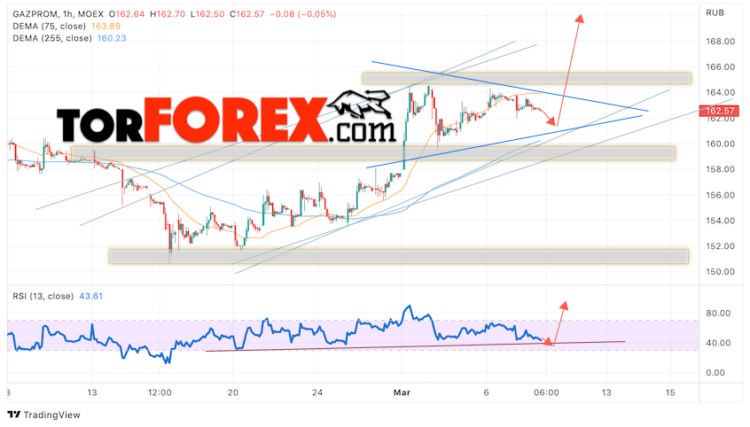 В пользу роста котировок GAZP выступит тест линии тренда на индикаторе относительной силы. Вторым сигналом выступит отбой от нижней границы модели ”Треугольник”. Отменой варианта роста стоимости акций Газпром станет падение и пробой уровня 157. Это укажет на пробой области поддержки и продолжение падения в область ниже уровня 145. Ожидать подтверждения росту котировок GAZP стоит с пробоем области сопротивления и закрытием выше уровня 166, что укажет на пробой верхней границы модели ”Треугольник” и начало отработки паттерна с целями вверху.