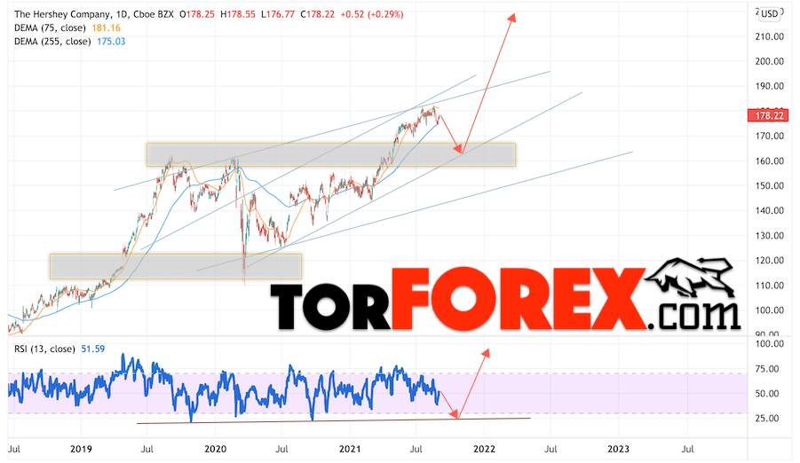 Стоит ли покупать или продавать акции Hershey Company сегодня? До каких уровней могут расти акции этой компании через год, два, три? Сколько будут стоить бумаги Hershey Company в 2021, 2022, 2023 годах? Мы давно составляет прогнозы курсов валют, а также можем предсказать поведение фондового рынка с помощью технического анализа и простых индикаторов.