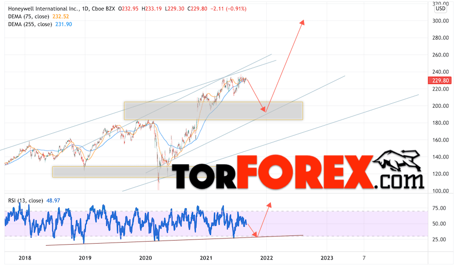 Дополнительным сигналом в пользу роста котировок Honeywell International выступит тест линии поддержки на индикаторе относительной силы (RSI). Вторым сигналом станет отскок от нижней границы бычьего канала, а здесь располагается важная область поддержки. Отменой варианта подъёма котировок стоимости акций компании HON станет падение и пробой уровня 185.05. Это укажет на пробой области поддержки, в этом случае можно рассматривать продолжение снижения бумаг в область на уровне 120.05. Ожидать подтверждения подъёма акций стоит с пробоем области сопротивления и закрытием выше уровня 240.55, как видим, пока этот уровень не удается взять покупателям.