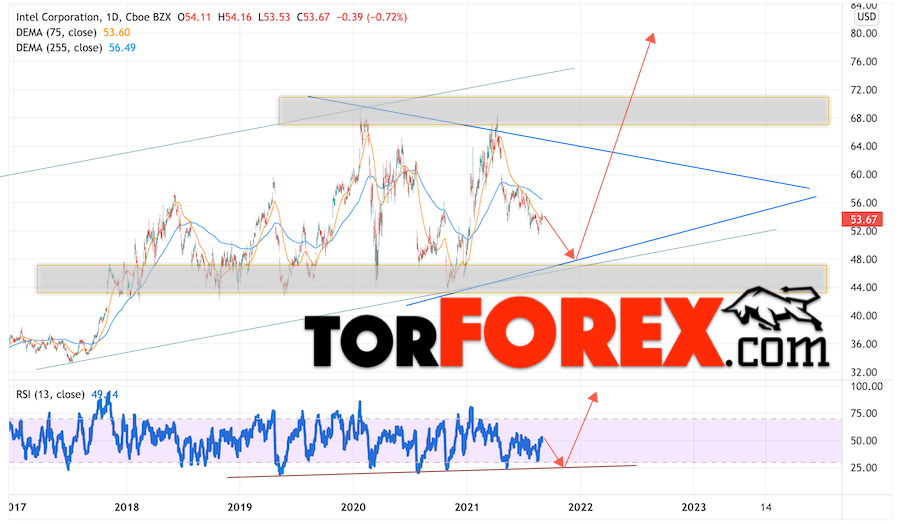 Стоит ли покупать или продавать акции Intel сегодня? До каких уровней могут расти акции этой компании через год, два, три? Сколько будут стоить бумаги Intel в 2021, 2022, 2023 годах? Мы давно составляет прогнозы курсов валют, а также можем предсказать поведение фондового рынка с помощью технического анализа и простых индикаторов.