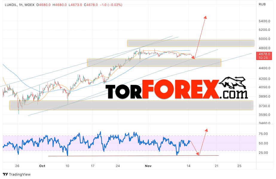 В пользу подъёма стоимости и котировок LKOH выступит тест линии поддержки на индикаторе относительной силы. Вторым сигналом станет отскок от нижней границы бычьего канала. Отменой варианта роста акций Лукойл станет падение и пробой уровня 4255. Это укажет на пробой нижней границы канала и продолжение снижения котировок LKOH в область ниже уровня 3735. Подтверждением подъёма цен и курса акции выступит пробой области сопротивления и закрытие выше уровня 4925.